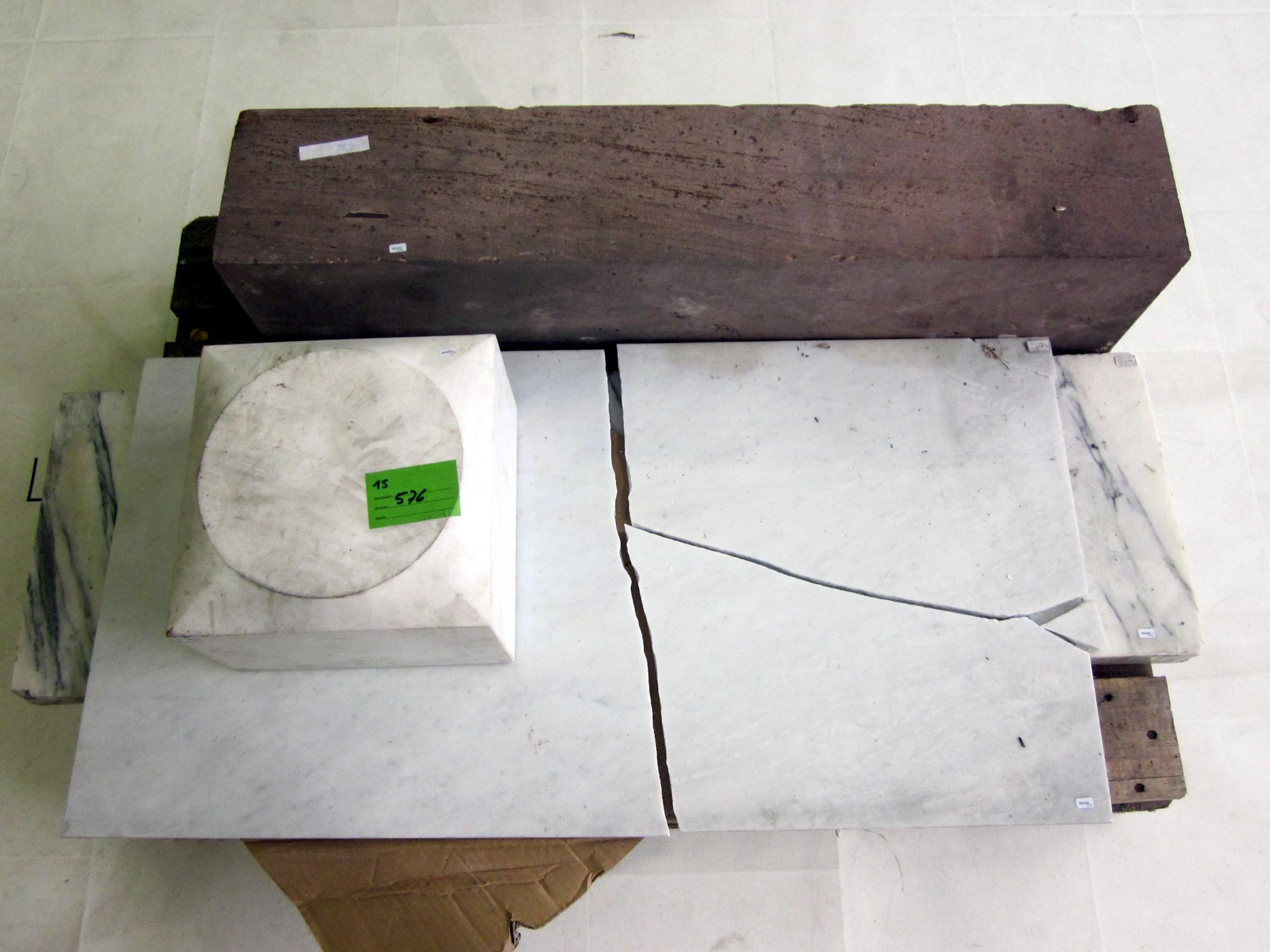 Zwei Marmorstücke, eine Marmorplatte, ein Stück Sandstein. L.31/103cm. Zustand B/C.