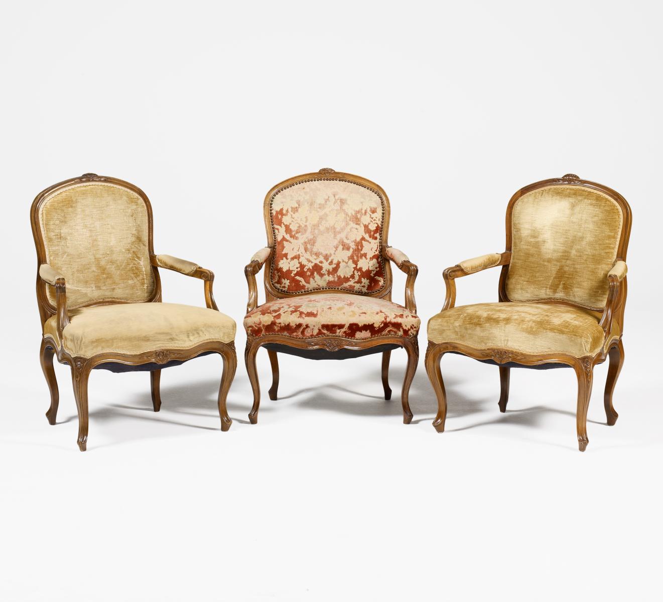Nussbaum geschnitzt. Gepolstert. {Beil.:} Armlehnsessel. Style Louis XV. H.98cm. Zustand B.