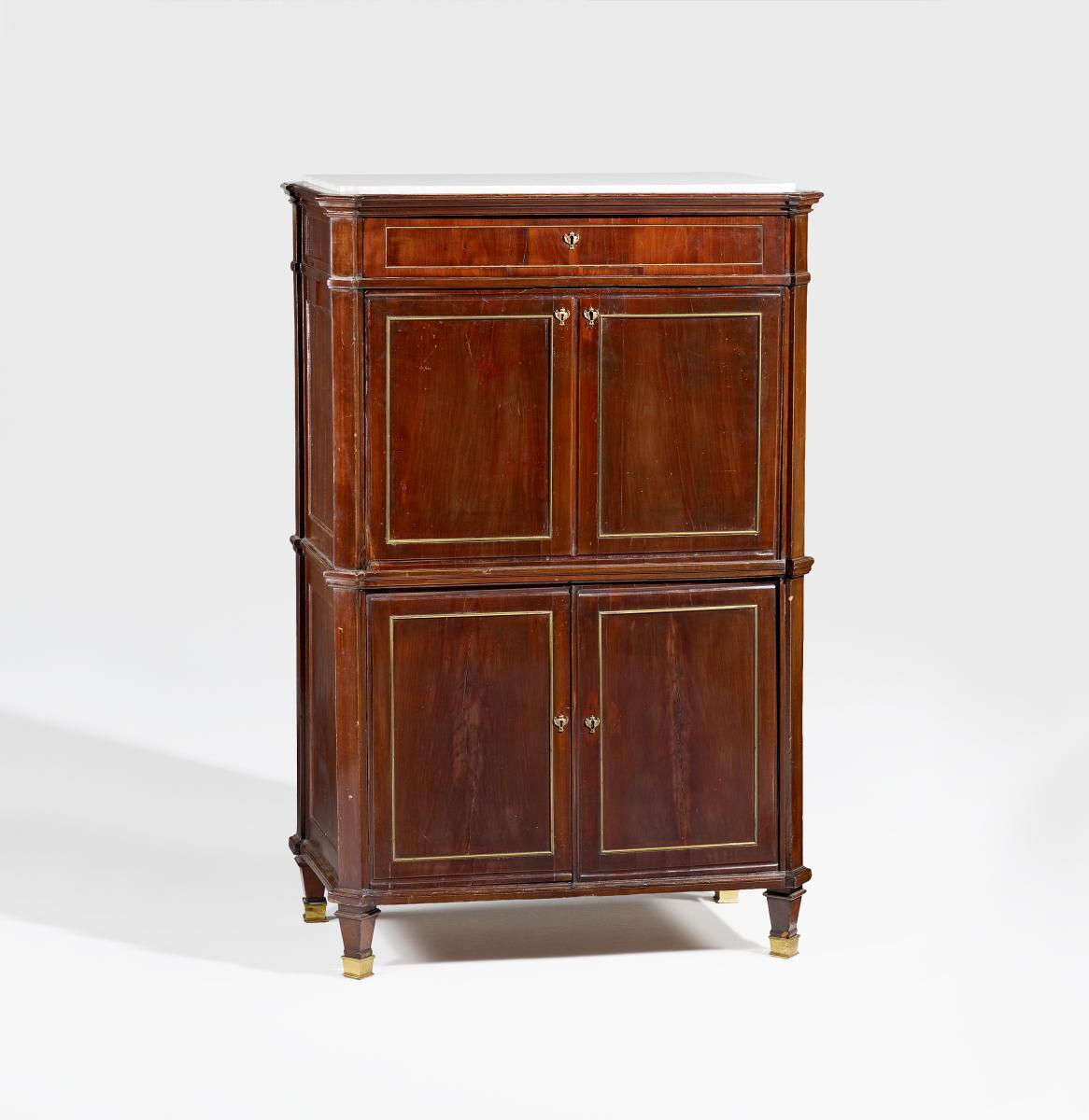 Kirschbaum(?) mit mahagonifarbener Politur. Messingeinlagen. 144x91x55cm. Zustand C. Stark ergänzt.