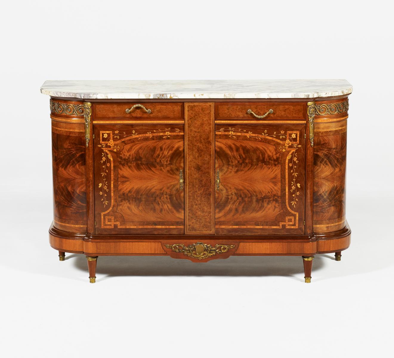 Mahagoni, tlw. eingelegt. Marmorplatte. Bronzeapplikationen. 103,5x169x56cm. Zustand B/C.