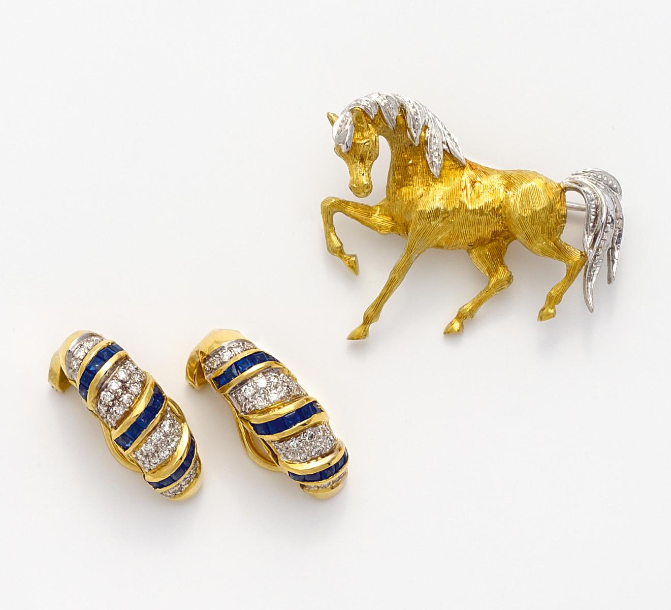 750/- Gelb-/Weißgold, gestempelt. 13,2g. 30 winzige Saphir-Karrees, 42 winzige Brillanten, Ohrclips: 1,8 x 0,6cm, Brosche: 3,0 x 2,3cm.~ Die Ohrclips können zu Ohrsteckclips umgewandelt werden.