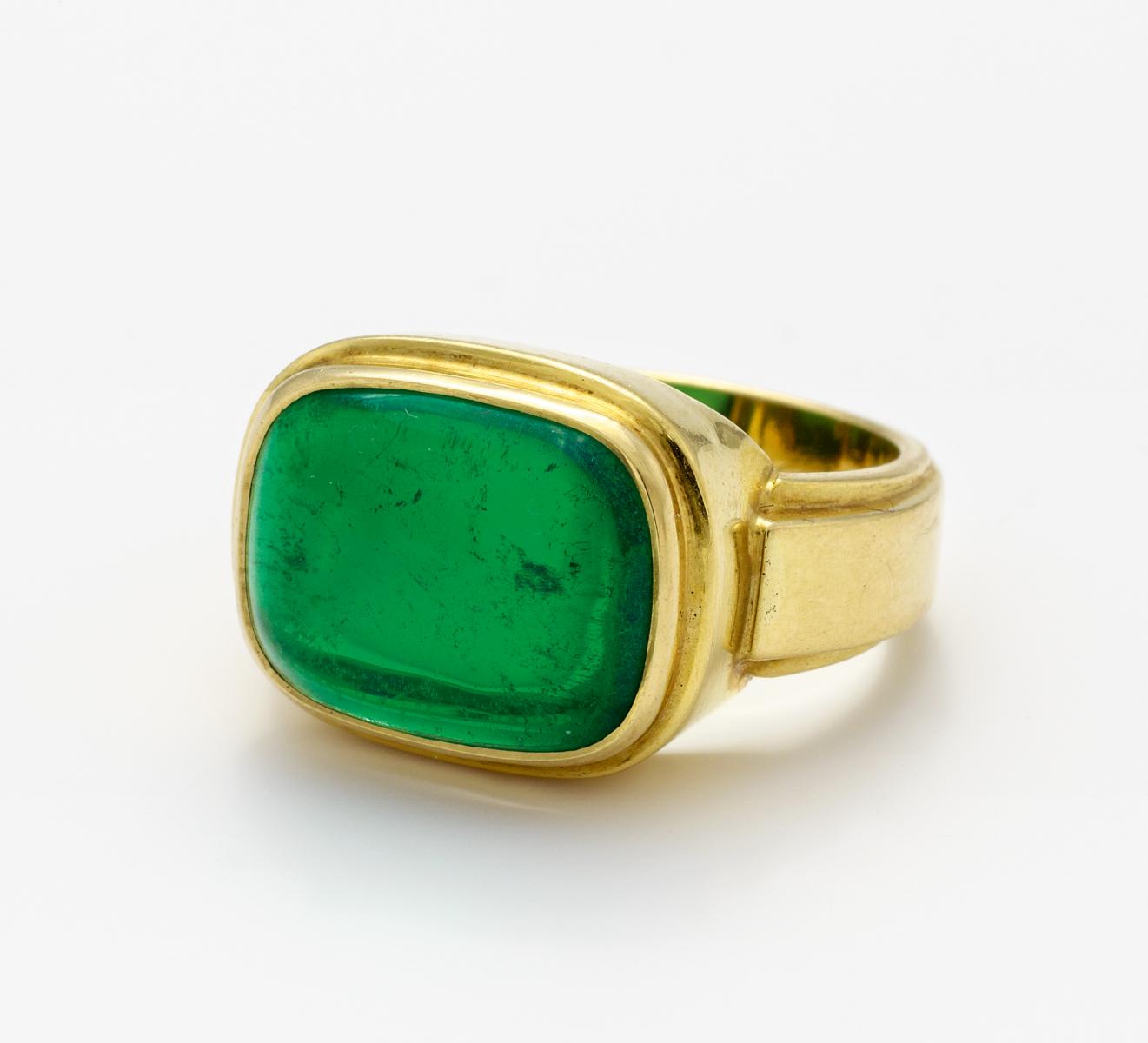 750/- Gelbgold, gestempelt. 12,2g. 1 leicht ovaler Smaragdcabochon, EU-RM: 54.
