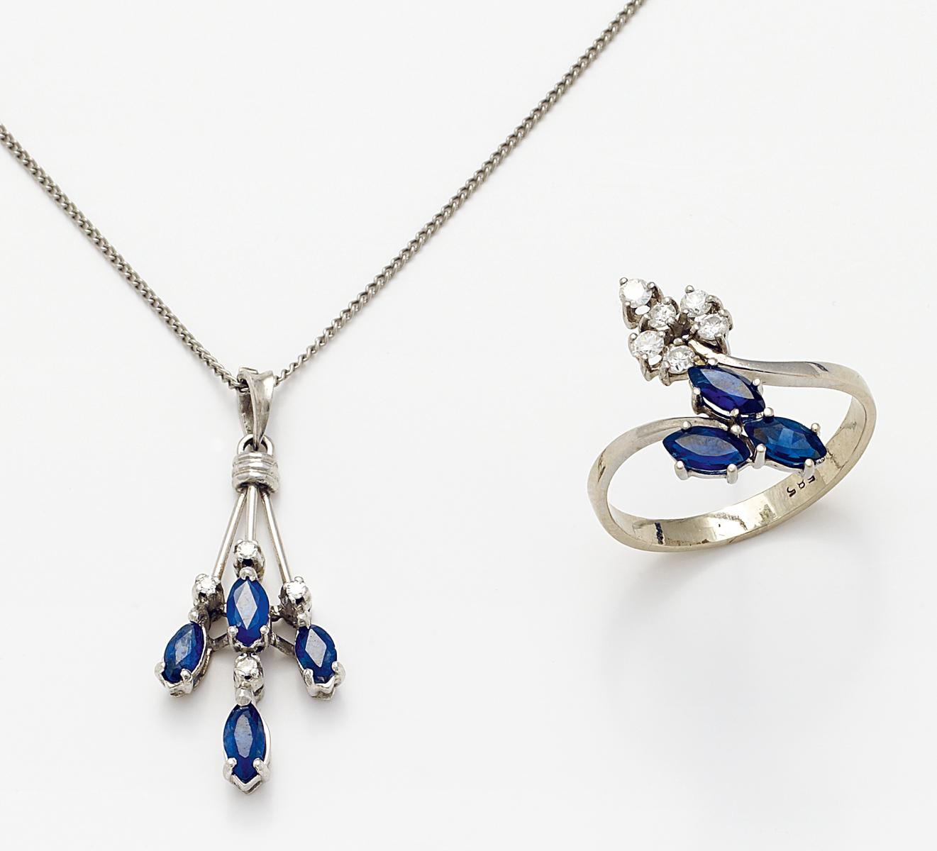 Set: Ring und Anhängerkette mit Saphir-Diamantbesatz.