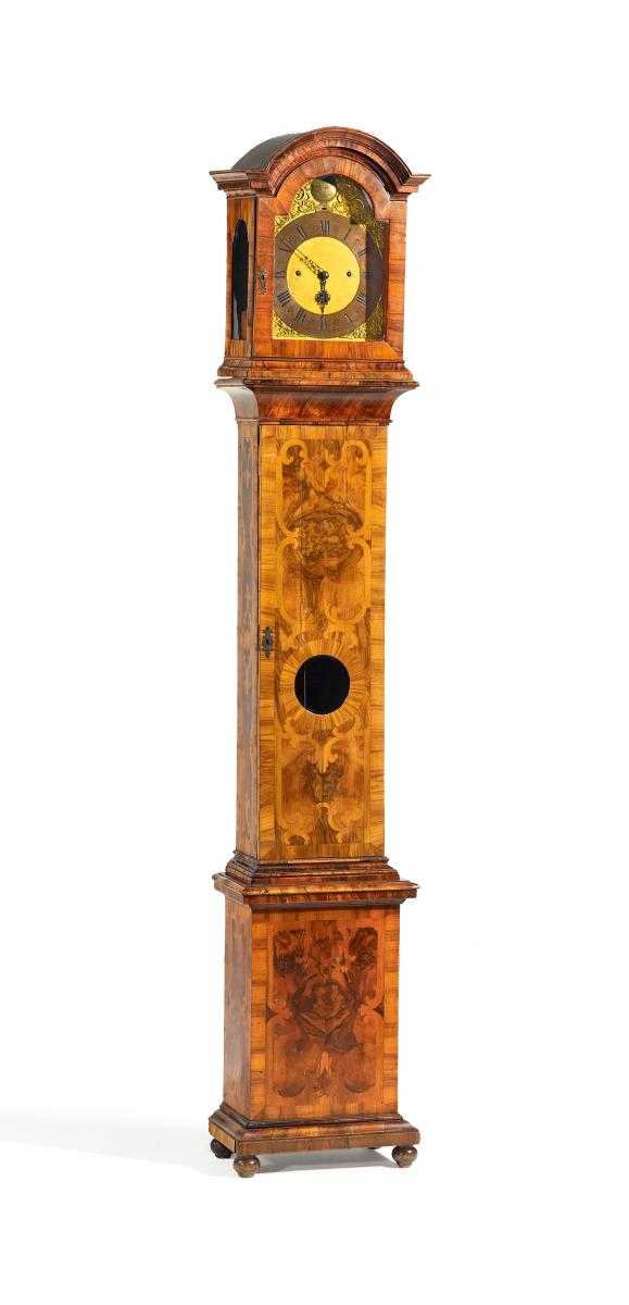 Nussbaum poliert und eingelegt. Vergoldetes Zifferblatt mit Kupferring. Geradliniger, eintüriger Kasten. Dreiseitig verglaster Kopf mit geschwungenem Gesims.