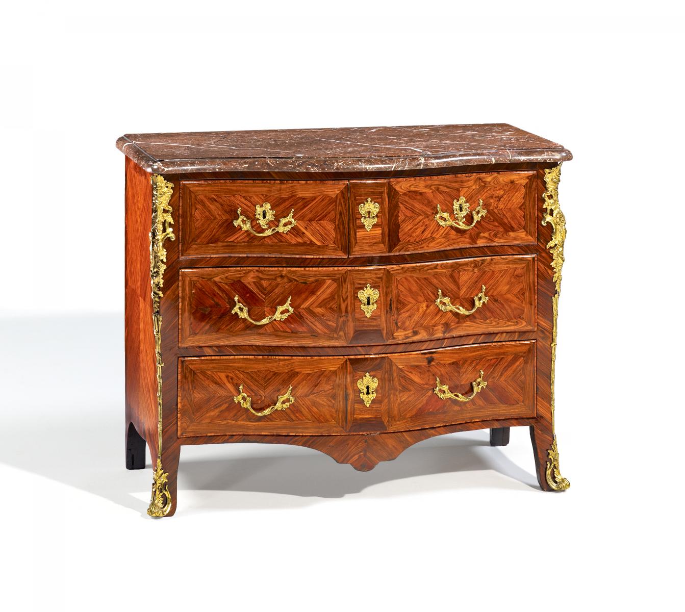 Rosenholz, poliert und eingelegt. Bronzeapplikationen. Marmorplatte. Vierschübiger leicht geschwungener Korpus. 85x107,5x57cm. Zustand B.