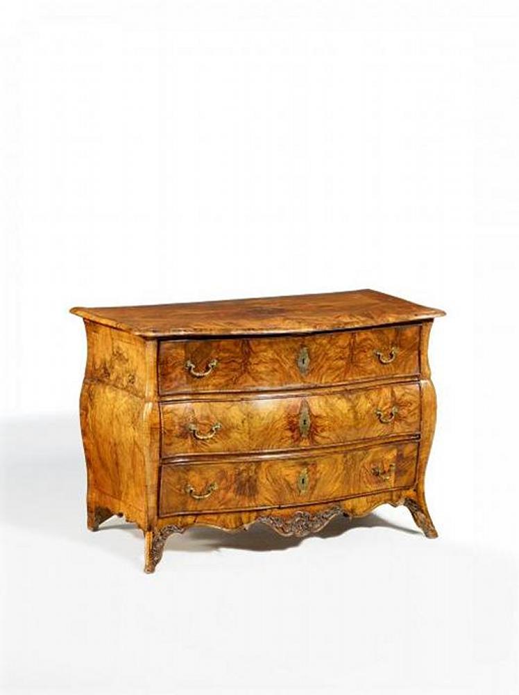 Nussbaum und Nussbaummaserholz poliert und tlw. beschnitzt. Geschwungener, im oberen Drittel leicht eingezogener Korpus auf ausgestellten Beinen mit