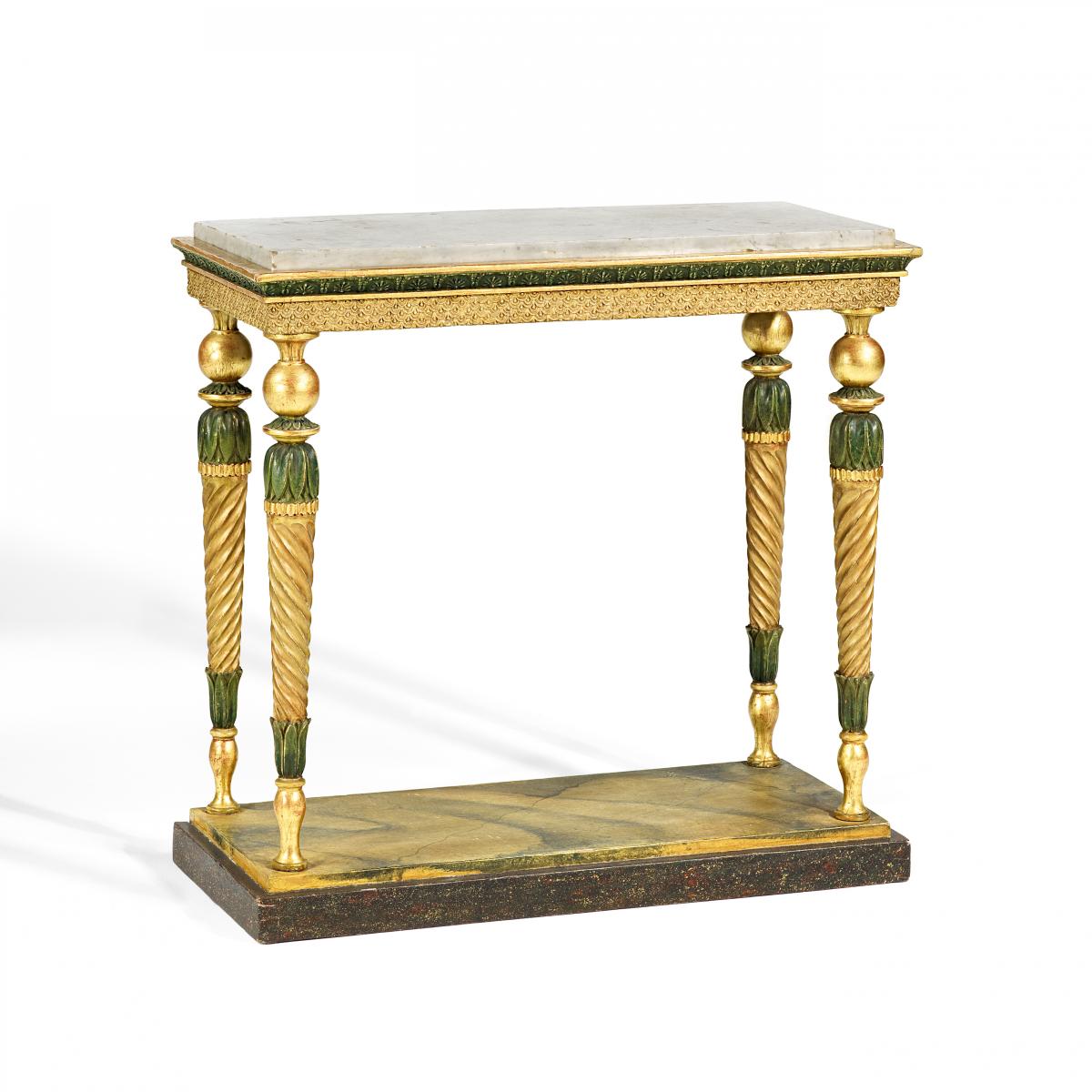 Holz geschnitzt, vergoldet und tlw. grün gefasst. Marmorplatte. Rechteckiger Korpus mit Marmor imitierender Sockelplatte, darauf vier floral gestaltete