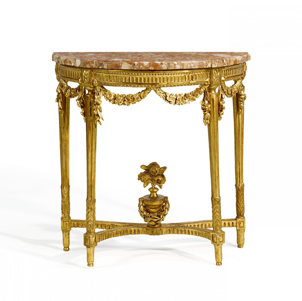 Holz, geschnitzt und vergoldet. Marmorplatte. Halbrunder Korpus auf vier kannelierten verstrebten Stützen. Girlanden- und Urnendekor. 92x92x48cm. Zustand C.