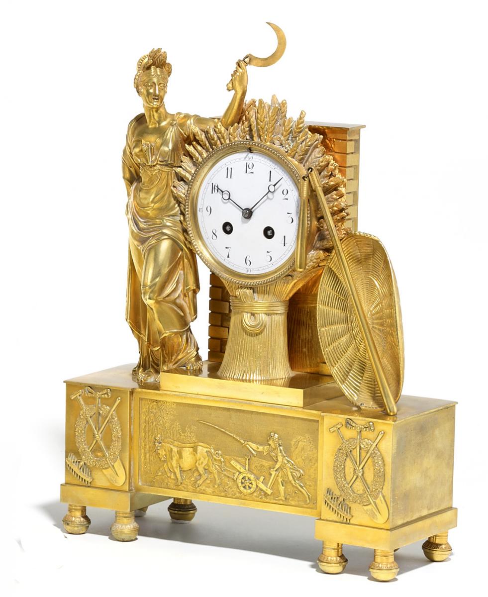 Bronze vergoldet. Emailzifferblatt. Rechteckiger Sockel, Ährenkranz und Erntegeräte als Applikation, im Mittelfeld