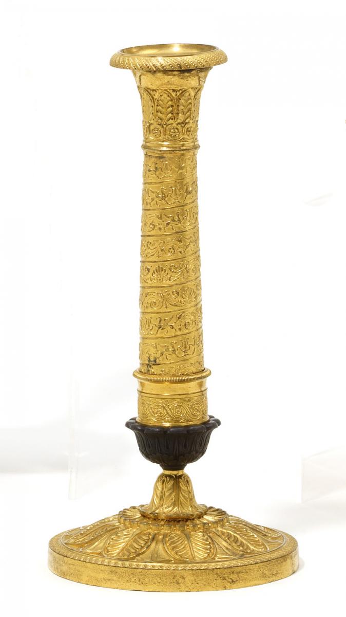 Bronze vergoldet und tlw. patiniert. Runder Fuß mit Akanthusblättern. Schaft mit umlaufendem Dekorband. Höhe 26,5cm. Zustand A/B.