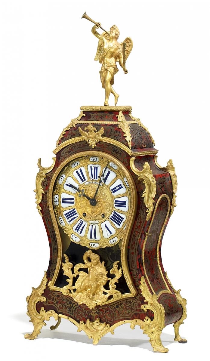 Boulle-Technik, Messing und Schildpatt ornamental eingelegt. Vergoldete Applikationen. Emailkartuschen. Geschwungenes Gehäuse mit Akanthusblattzier. Verglaste Fronttür mit Amor. Reliefiertes