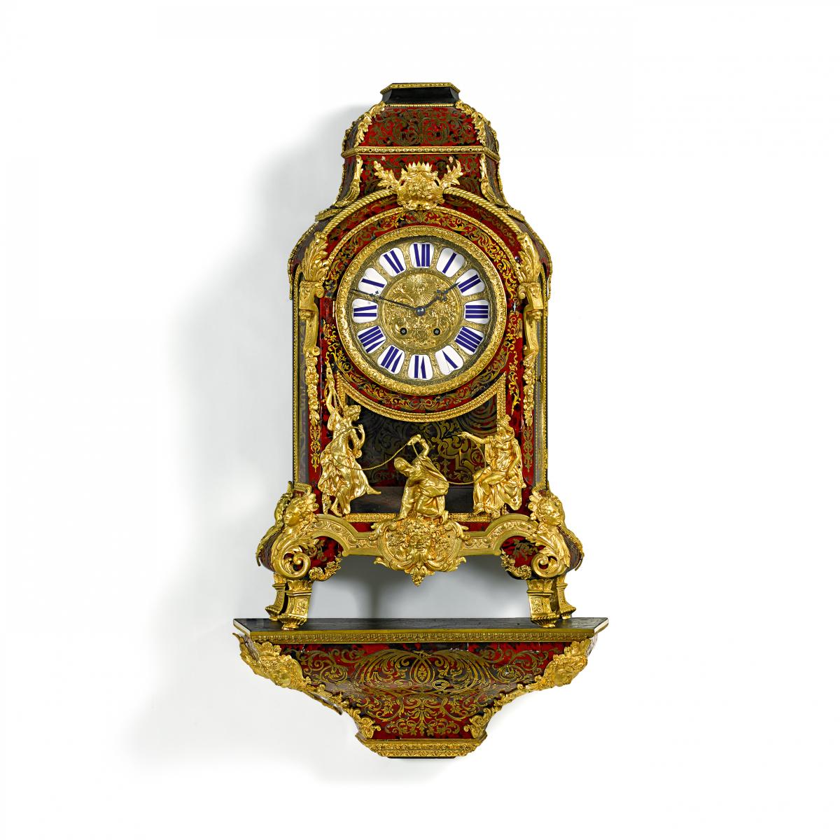 Boulle-Technik, Schildpatt und Messing ornamental eingelegt. Vergoldete Applikationen. Emailkartuschen. Geschwungene Konsole mit Frauenköpfen. Hochrechteckiges, abgerundetes Gehäuse mit