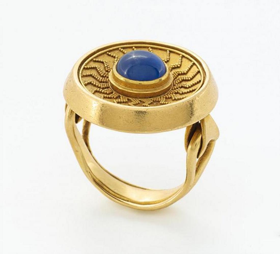 750/- Gelbgold, Gewicht: 14,1g. 1 runder Saphircabochon ca. 1,80ct, EU-RM: 51. Ringtop: D.ca. 2,2cm. Fritz Deutsch war neben Christa Bauer, Falko Marx und Gertrud Weber-Vogel ein Schüler von