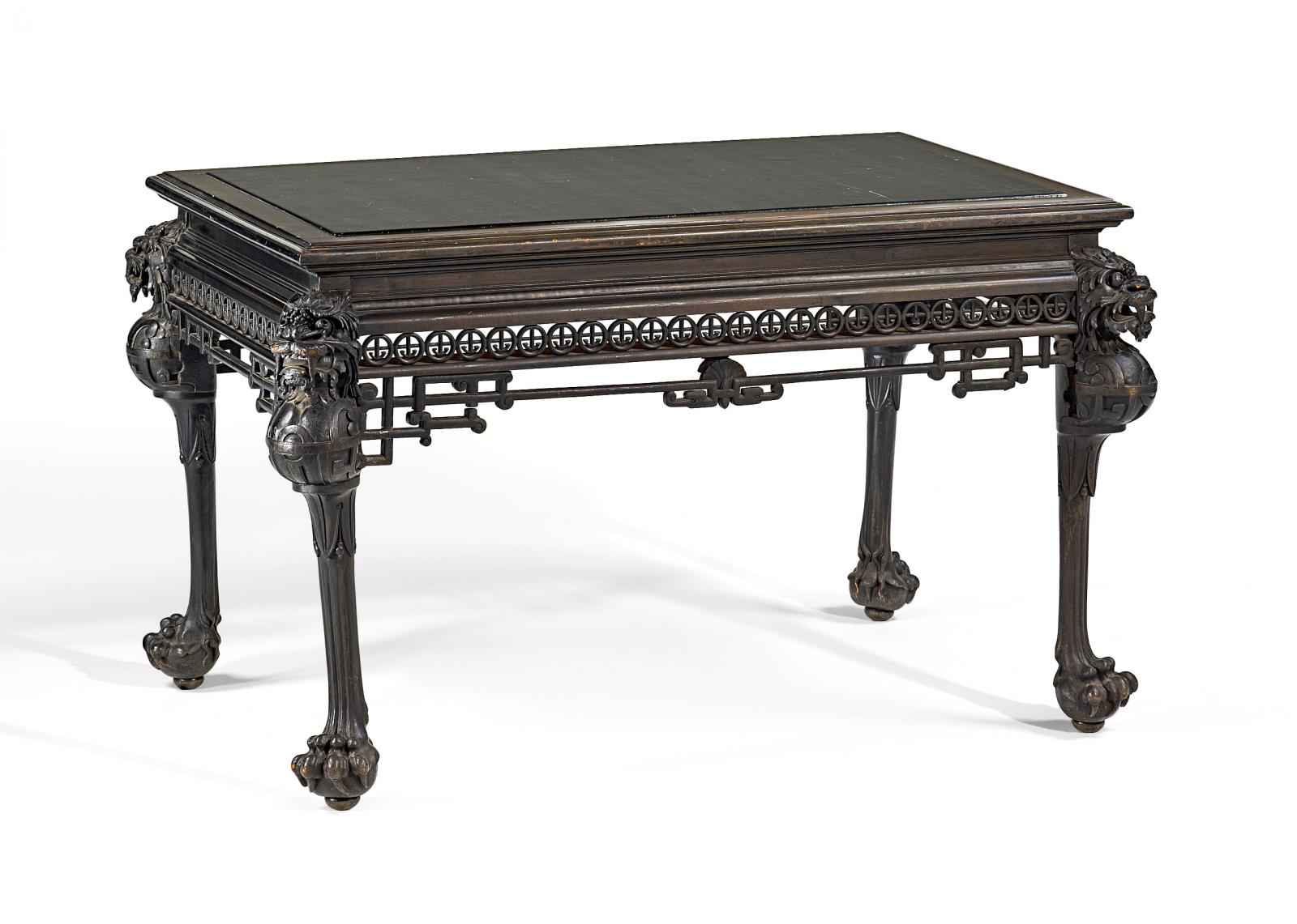 Holz, tlw. ebonisiert, tlw. Ebenholz. Auf vier als Drachen geformte Stützen liegende rechteckige Tischplatte. Zarge durchbrochen