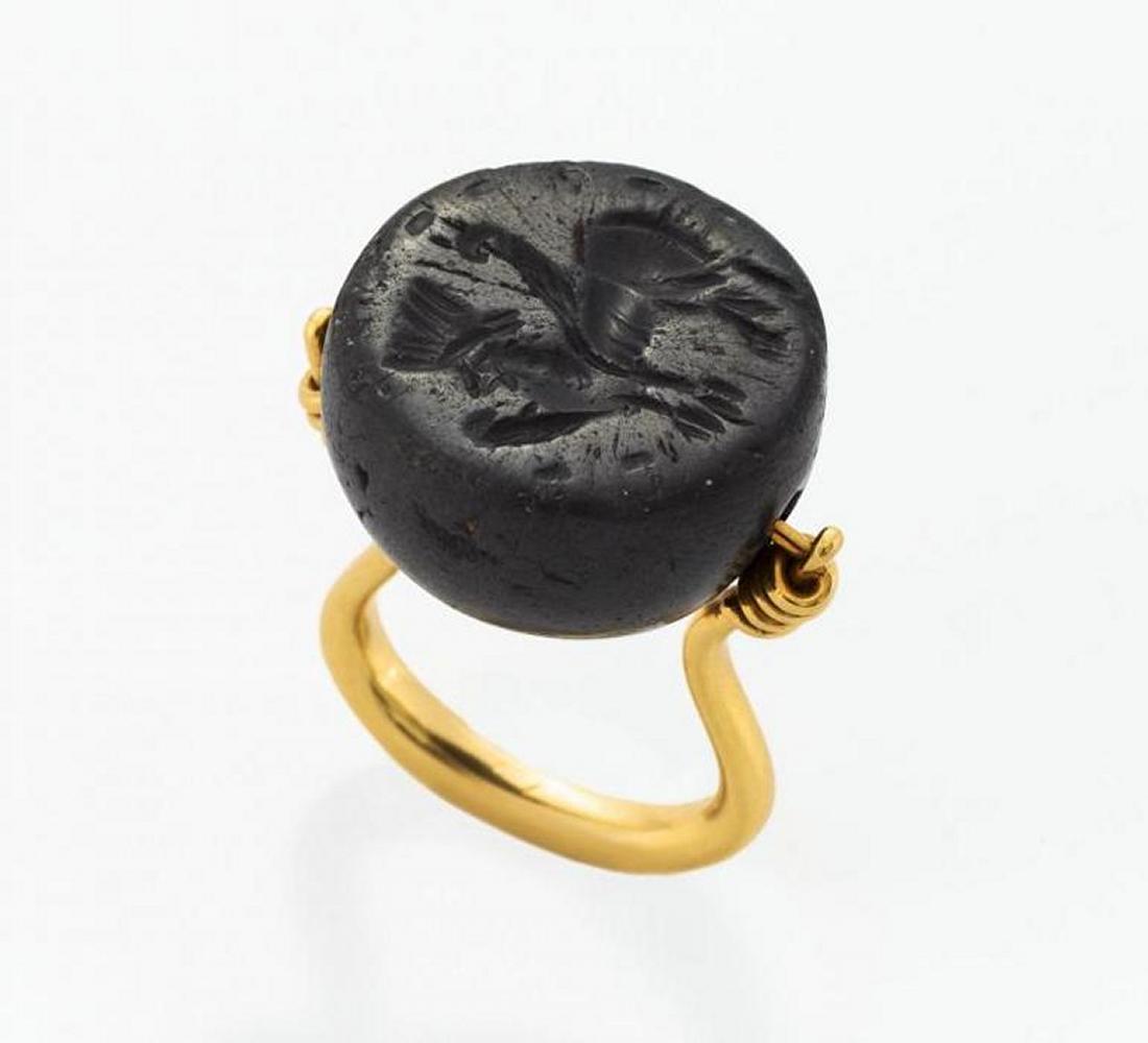 750/- Gelbgold, Gewicht: 18,2g. 1 handgravierte Gemme aus Hämatit, D.ca. 2,0cm, EU-RM: 49. Ringtop: D.ca. 2,0 x 2,5cm. Unsigniert. Der Ringschenk ist aus einem U-förmigen Bügel geschmiedet und geht auf ein