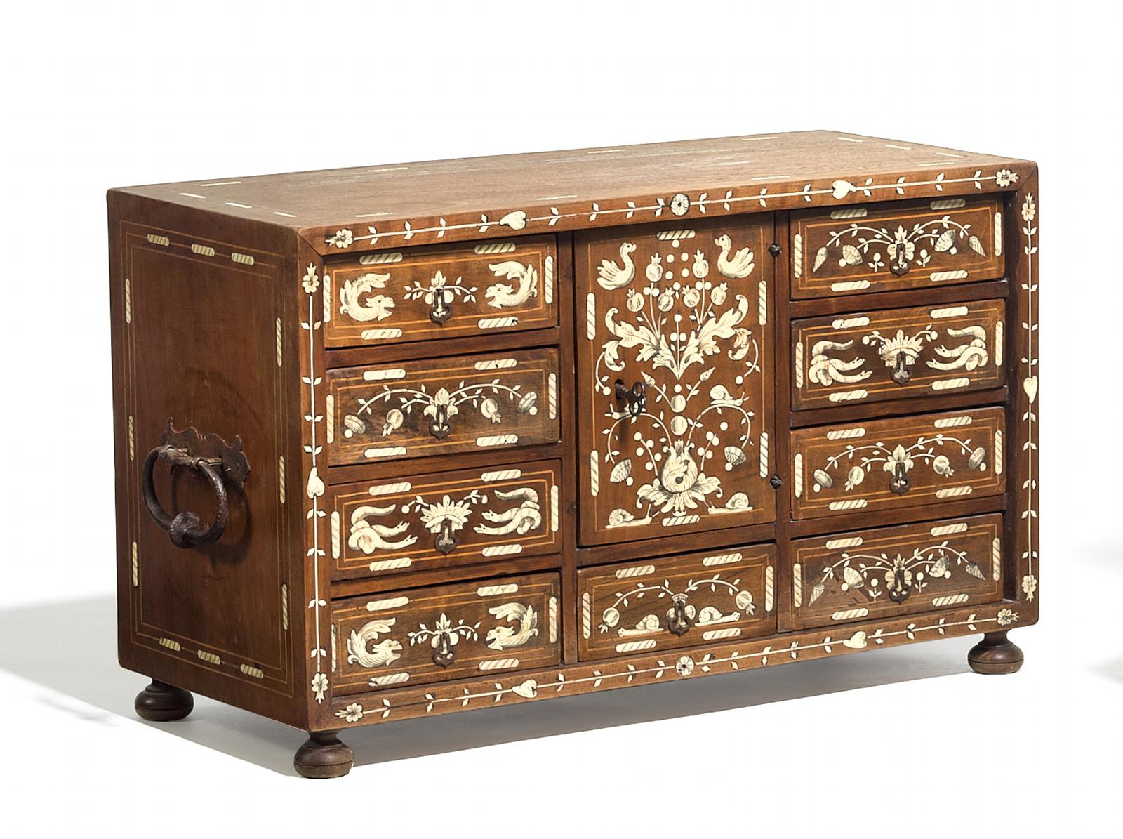 Nussbaum mit Beineinlagen. Eisengriffe. Kastenform mit zentraler Tür von neun Schüben gerahmt. Zwischen Bändern Blumen, Vögel,