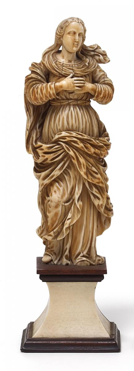 Elfenbein geschnitzt. Holzsockel tlw. mit Elfenbein verkleidet. Standfigur mit reich bewegtem Kleid. Höhe mit Sockel 26cm. Zustand B.