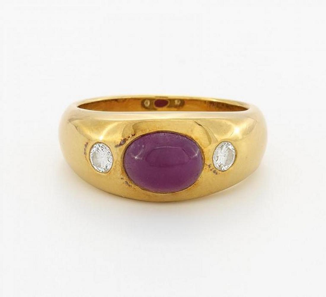 750/- Gelbgold, Gewicht: 15,3g. 1 ovaler Rubin-Cabochon ca. 2,29ct, 2 Brillanten zus.ca. 0,32ct W(H) SI, EU-RM: 62.