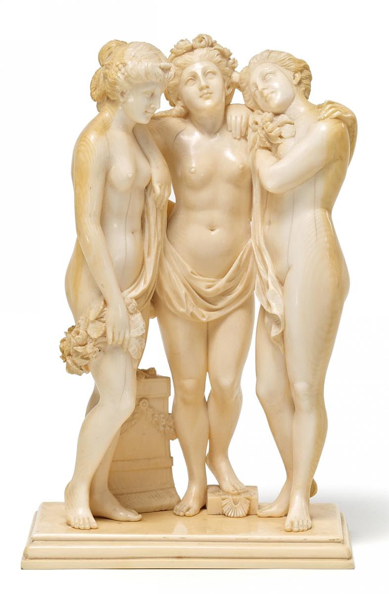 Elfenbein geschnitzt. Auf rechteckiger Plinthe die drei Grazien eng umschlungen mit Blumengirlanden. Höhe 24,5cm. Zustand A/B.