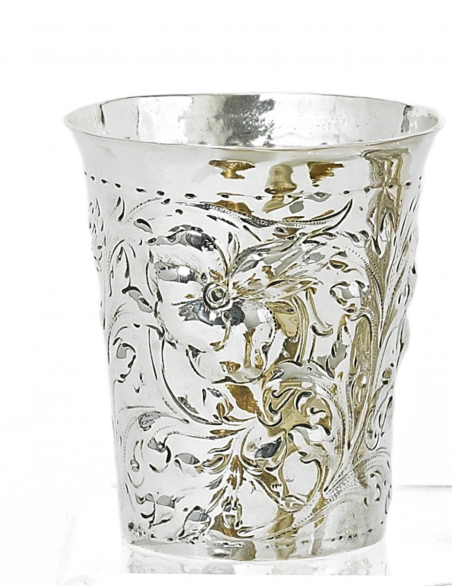 Silber. Auf flachem Boden leicht konischer Korpus mit ausgestelltem Rand. Höhe 9,5cm. Ca. 68g. Zustand B/C.