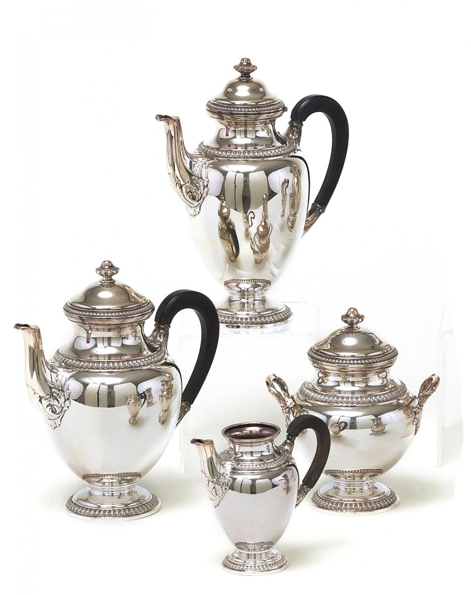 Silber, einmal mit Resten von Innenvergoldung. Ebonisierte Holzhenkel. Bestehend aus Kaffee- und Teekanne, Milchgießer und Zuckerdose. Höhe der Kannen 23/21,5cm. Ca. 1598g. Zustand A-B/C.