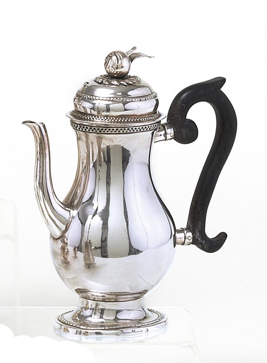 Silber. Ebonisierter Holzhenkel. Auf ovalem Stand birnförmiger Korpus mit stark gewölbtem Scharnierdeckel. Der Knauf in