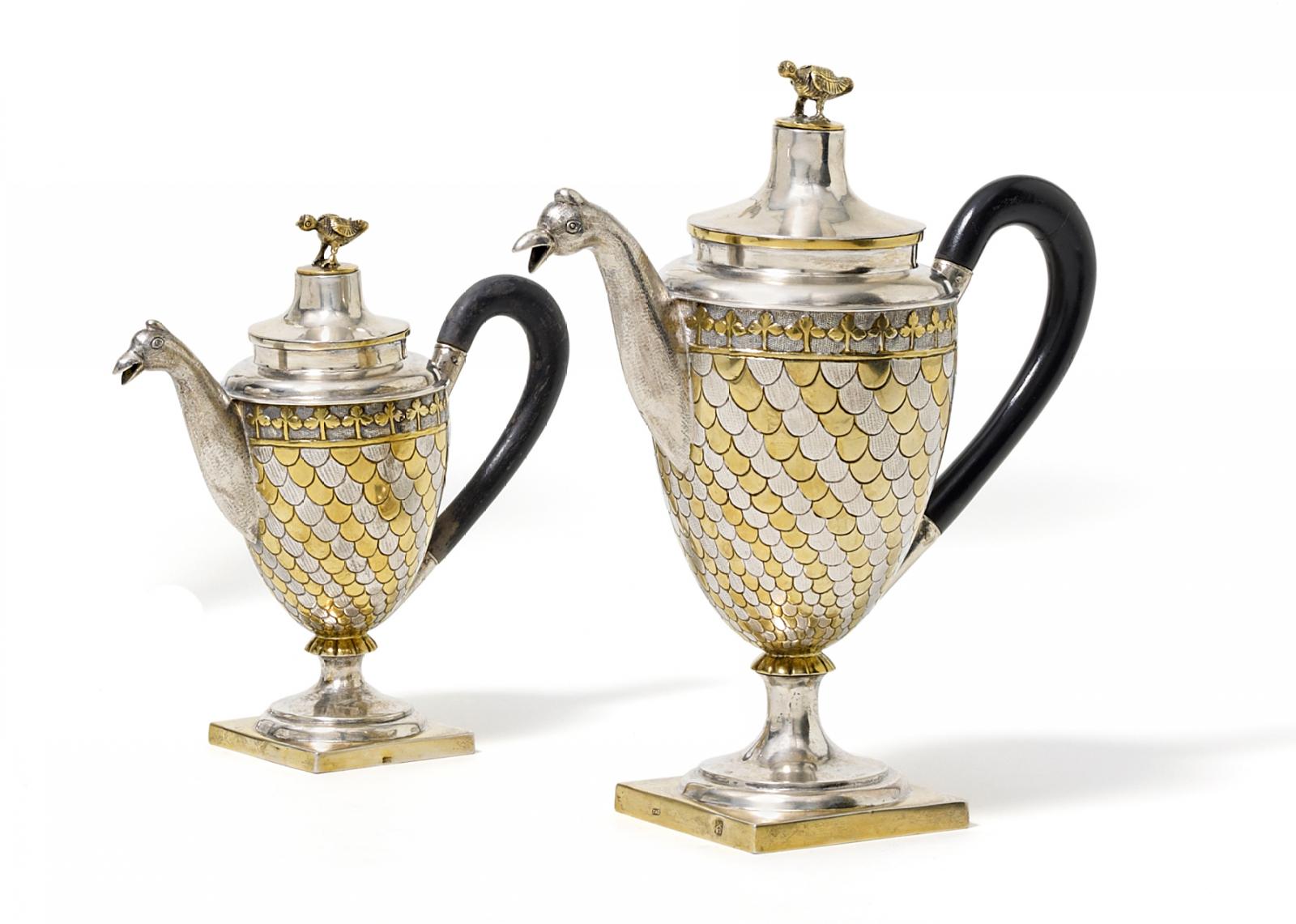 Silber, teilweise vergoldet. Ebonisierte Holzhenkel. Kaffeekanne und Milchkanne mit Rundfuß auf quadratischer Plinthe. Der ovoide Korpus mit