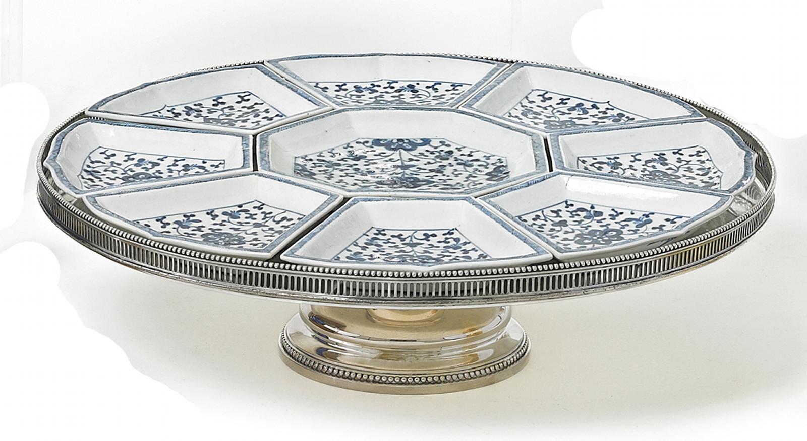 beschädigt sowie neun Keramikeinsätze. Höhe 10,5cm, ø 38,5cm. Ca. 1656g. Zustand B.