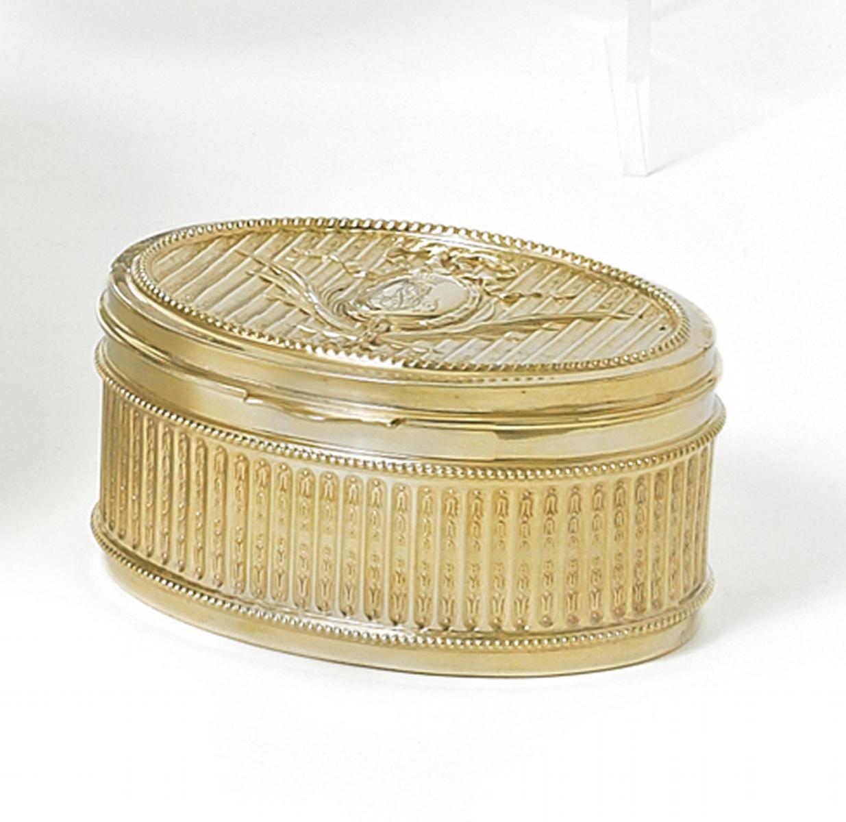 Silber, vergoldet. Auf Oberseite Monogramm MS unter Grafenkrone graviert. Höhe 6,5cm, Länge 13,5cm. Ca. 262g. Zustand A/B.