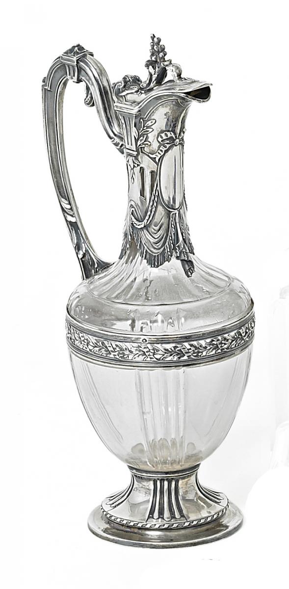 Silber mit Innenvergoldung. Glaskorpus. Unterhalb des Ausgusses mit scharniertem Deckel ovales Medaillon mit Schleifenzier und