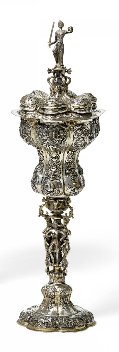 Silber mit Resten von Teilvergoldung und Innenvergoldung. Der Schaft mit drei plastisch gearbeiteten Nymphen zwischen Fruchtfestons. In querovalen