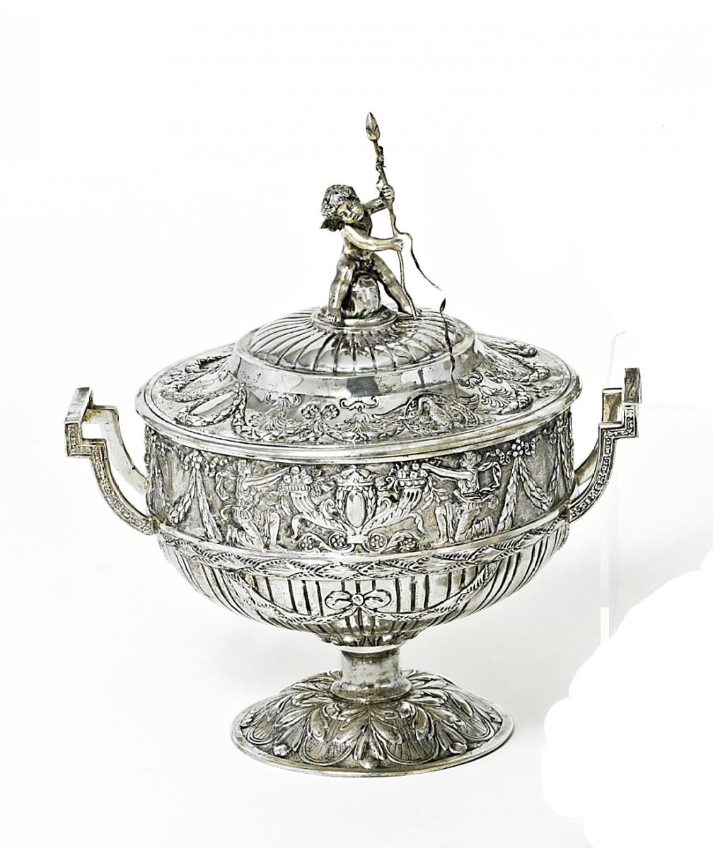 Silber. Reicher Reliefdekor mit Lorbeerfestons und antikisierenden Szenen. Höhe 28cm. Ca. 1210g. Zustand B/C.