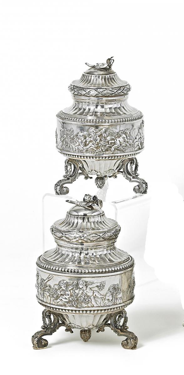 Paar prunkvolle Aufsatzgefäße mit Amoretten.