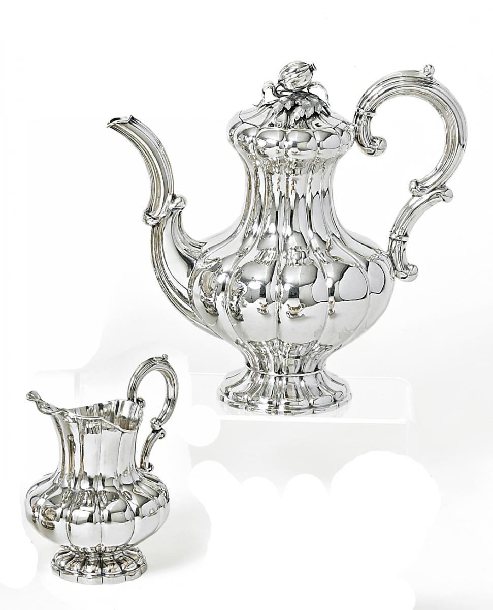 Kaffeekanne mit Melonenknauf und Milchgießer.