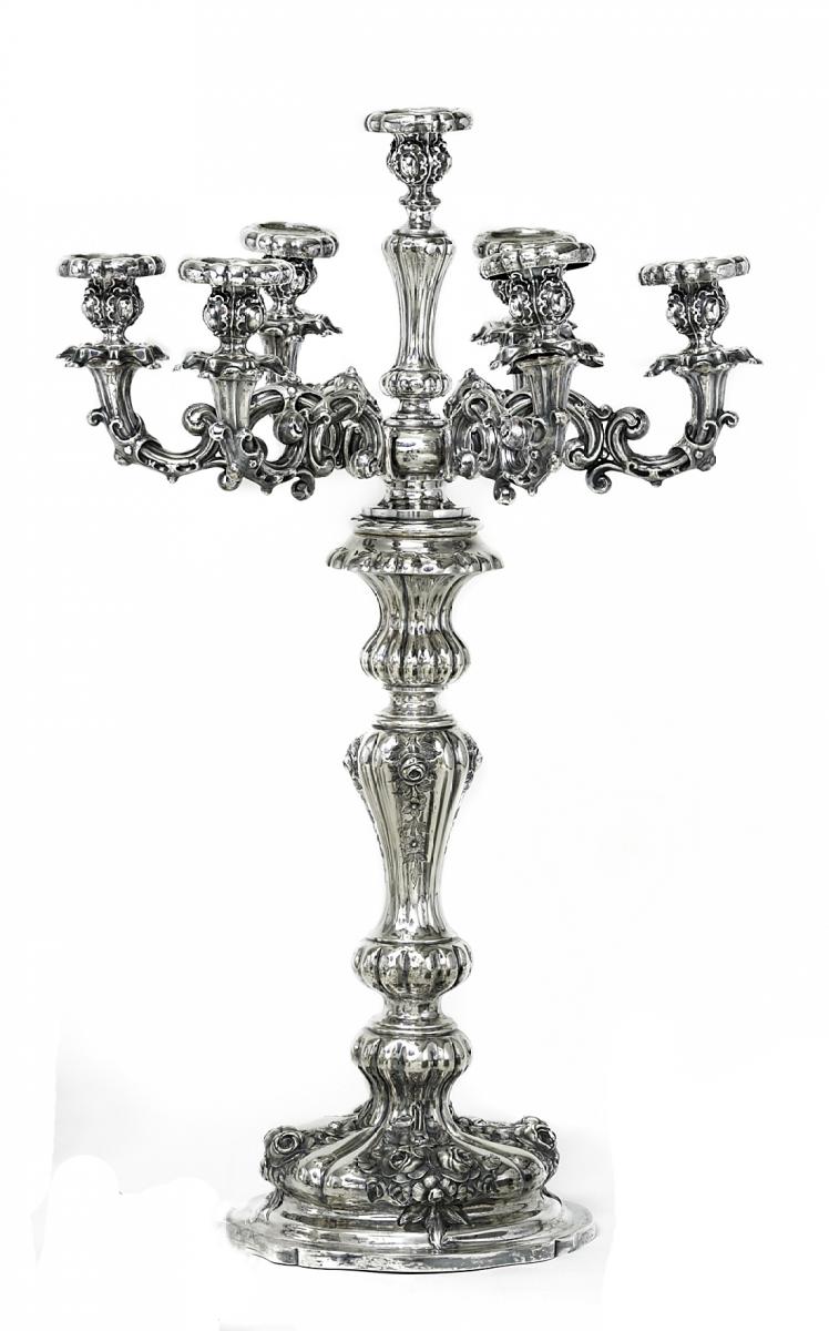siebenflammige Aufsatz mit C-Schwünge-Armen. Höhe 71cm. Ca. 2760g. Zustand C.