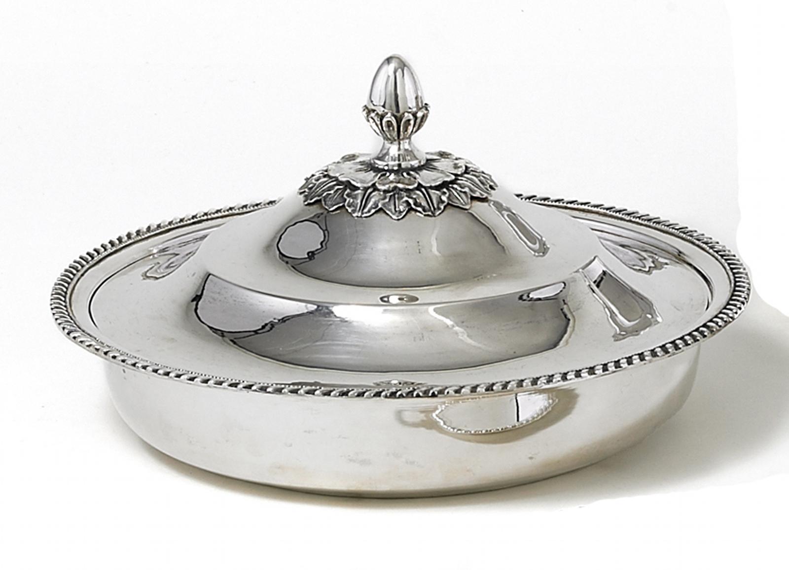 Silber. {Beil.:} Späterer Glaseinsatz und versilberter Untersatz. Höhe 16,5cm, ø 28,5cm. Ca. 1270g. Zustand A/B.