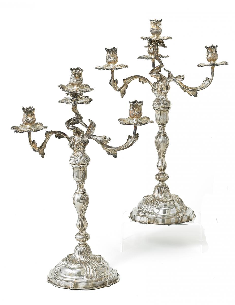 Silber. Vierflammiger Girandolenaufsatz mit Rankenarmen und Blättertüllen. Höhe 48cm. Füße gefüllt. Aufsätze ca. 2127g. Zustand A/B.