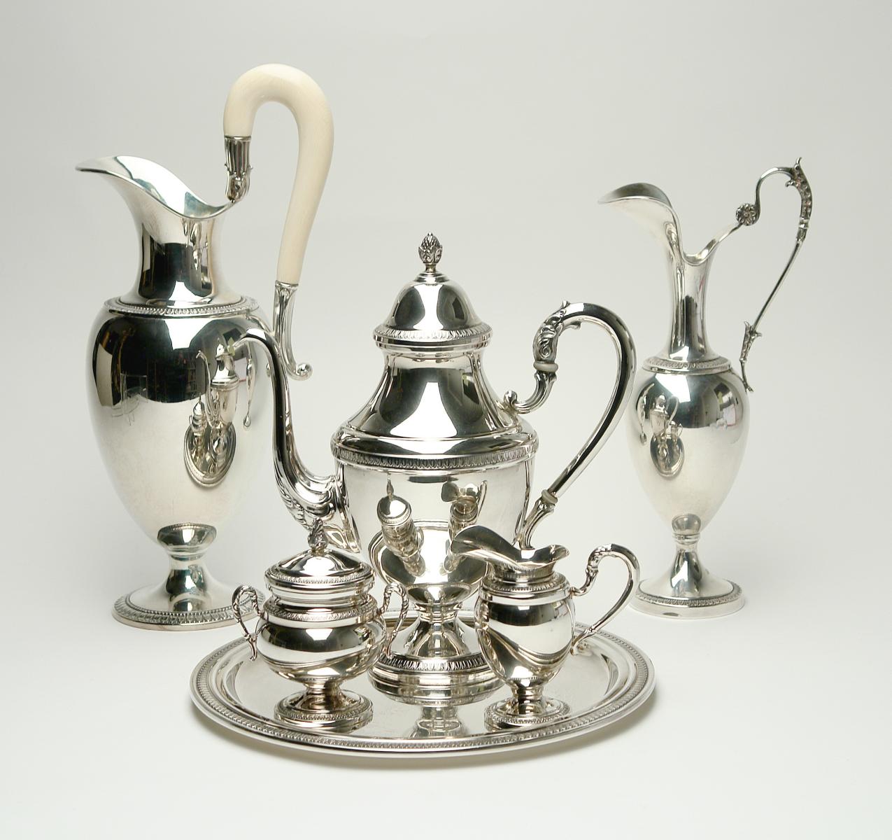 Silber. Eine der Karaffen mit Beinhenkel. Bestehend aus Mokkakanne, Zuckerdose, Sahnegießer und rundem Tablett. {Beil.:} Zwei