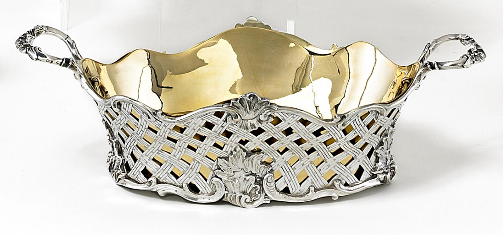Silber mit Innenvergoldung. Messingeinsatz. Ovale Form mit durchbrochen gearbeiteter Korbwandung. Punzierter Rocailledekor. Höhe 9cm, Länge 30,5cm. Ca. 586g. Zustand A.