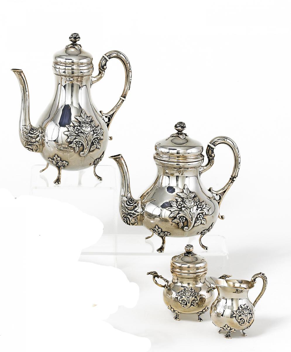 Silber. Bestehend aus Kaffee- und Teekanne, Zuckerdose und Sahnegießer. Höhe der Kannen 25/20,5cm. Ca. 1606g. Zustand A-A/B.