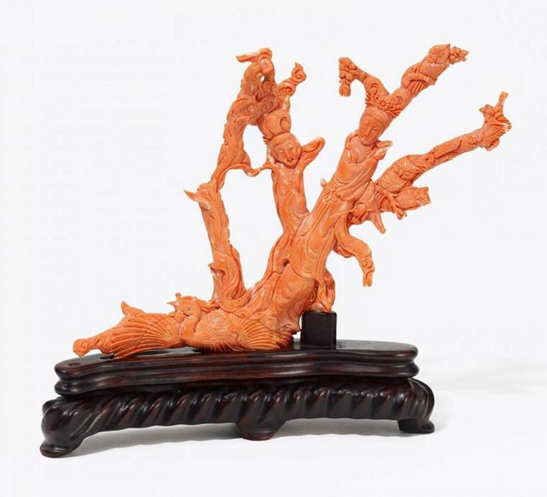 H x B=ca. 17,5 x 13,5cm (ohne Holzsockel). Ein geschnitzter und gravierter mehrarmiger Korallenast bestehend aus vier Zweigen, welche