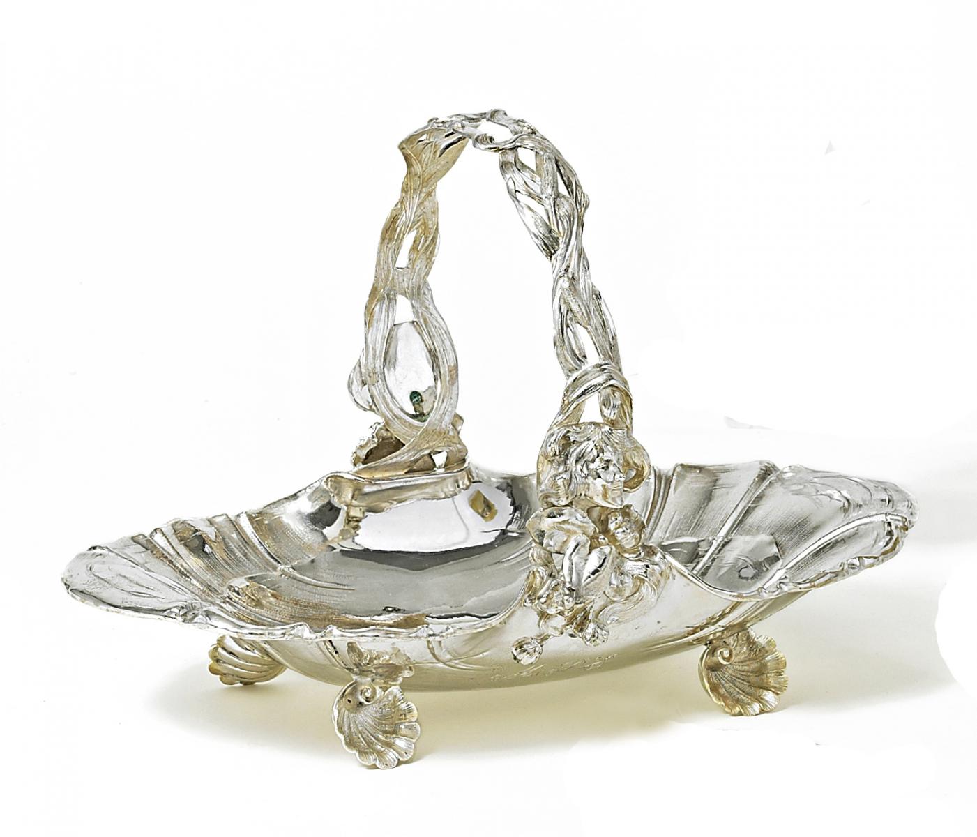 Silber. Auf vier Muschelfüßen ovale Schale in entsprechendem Dekor. Der feste Henkel in