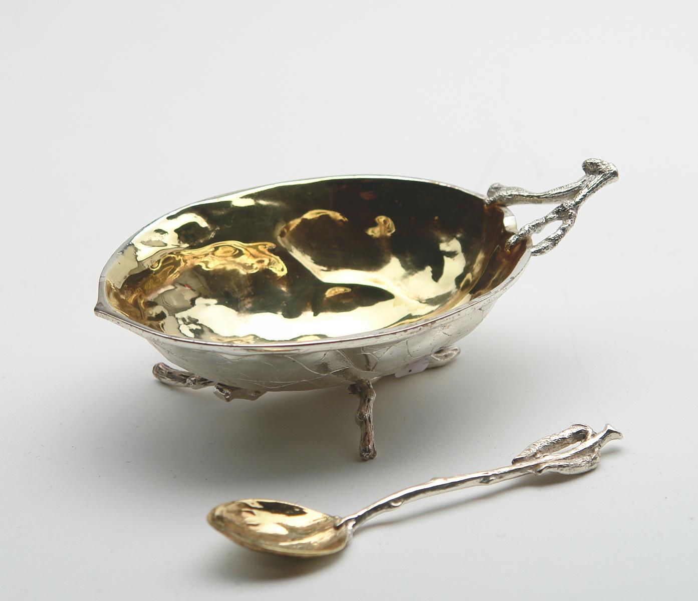 Silber mit Innenvergoldung. {Beil.:} Passender Zuckerlöffel. Wilkens & Söhne. Höhe 5cm, Länge 14cm. Ca. 132g. Zustand A.