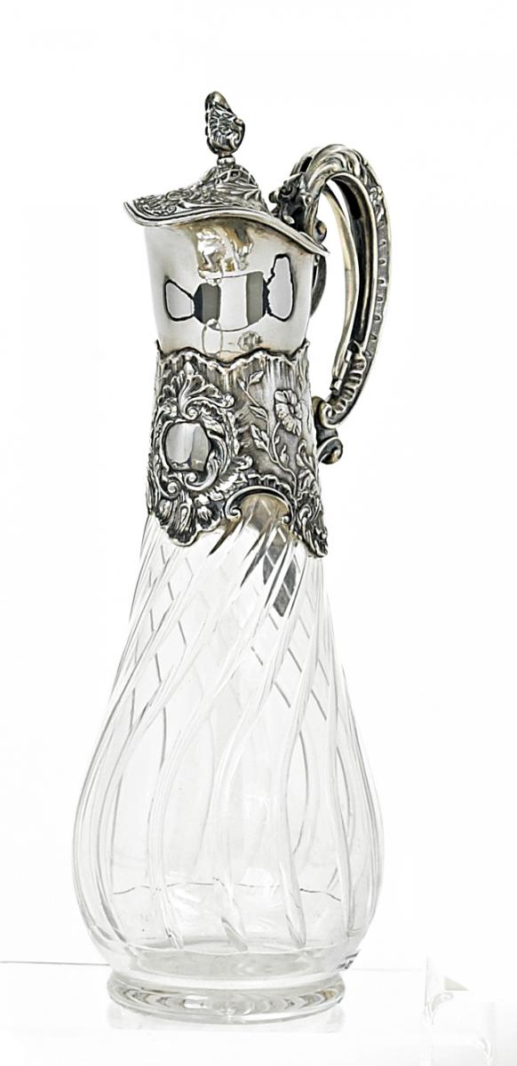 Silber mit Innenvergoldung. Korpus Kristallglas. Die Montierung mit reliefierten Rocaillen und Blüten. Scharnierter Deckel mit