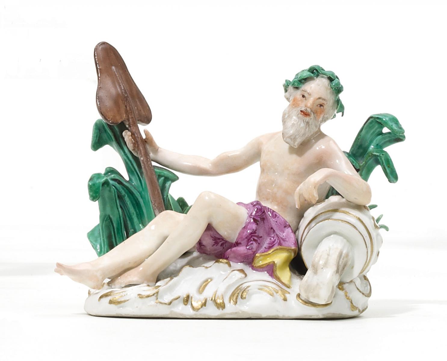 Porzellan, farbig staffiert. Auf ovalem Rocaillesockel liegend, ein Ruder in der Hand. Auf einer Amphore, aus der
