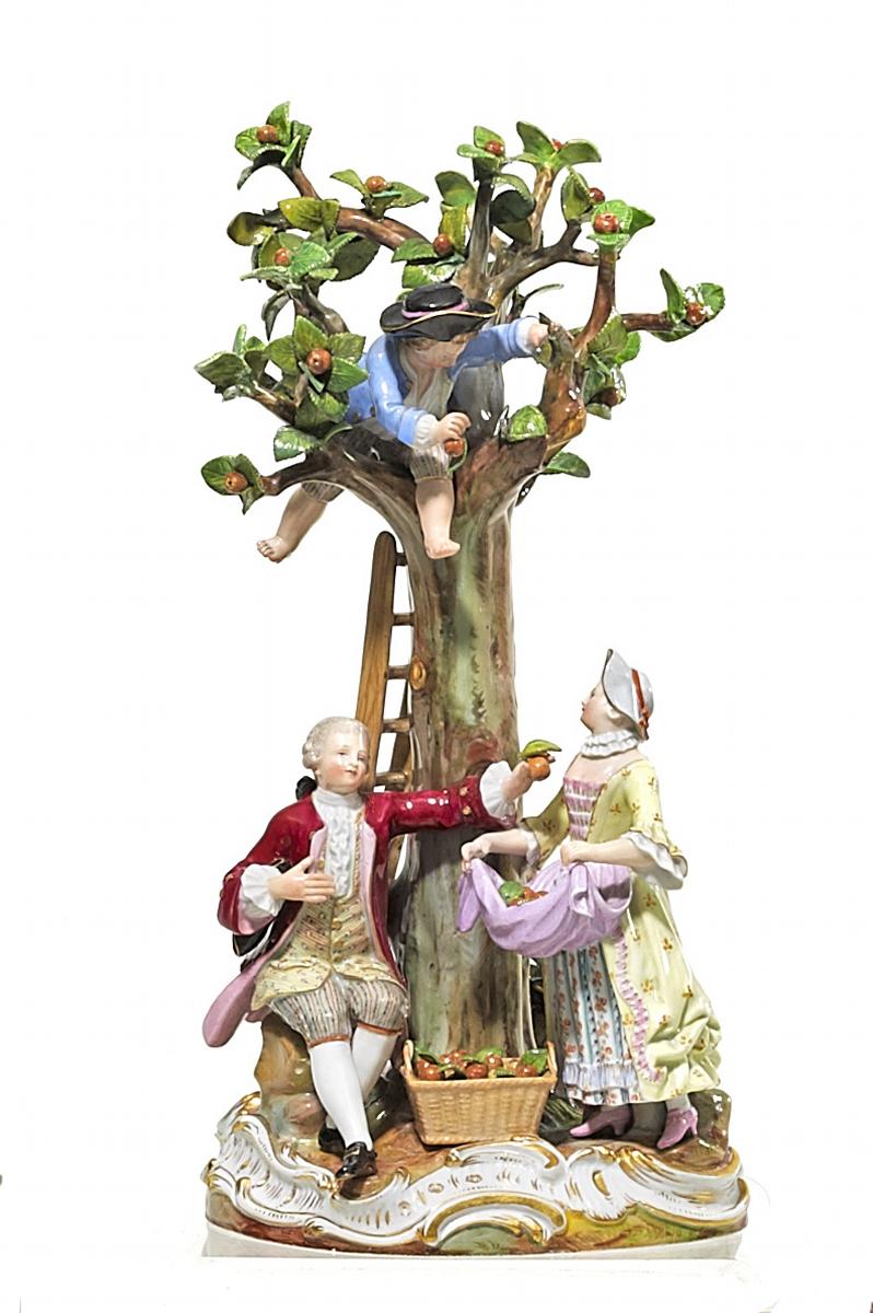 Porzellan, farbig und gold staffiert. Auf Erdsockel Apfelbaum mit junger Frau und zwei Kindern bei der Ernte. Neben der Dame