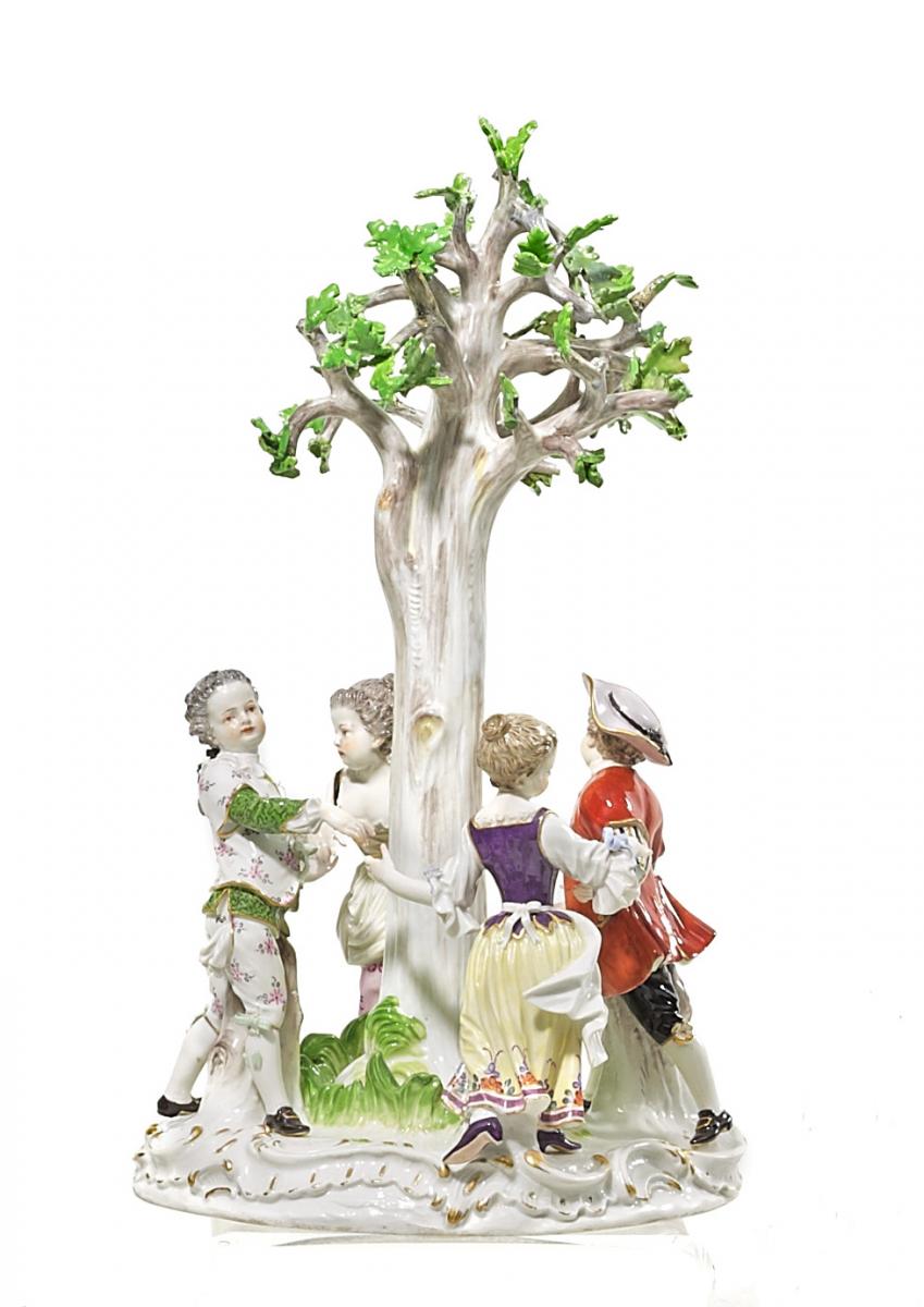 Porzellan, farbig und gold staffiert. Um Apfelbaum im Reigen tanzend zwei Jungen und zwei Mädchen. Höhe 31,5cm. Zustand C.
