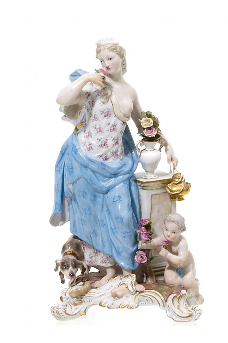 Porzellan, farbig und gold staffiert. Aus der Serie 'Die fünf Sinne'. Allegorie in antikem Gewand mit Blumen und Weihrauchgefäß.