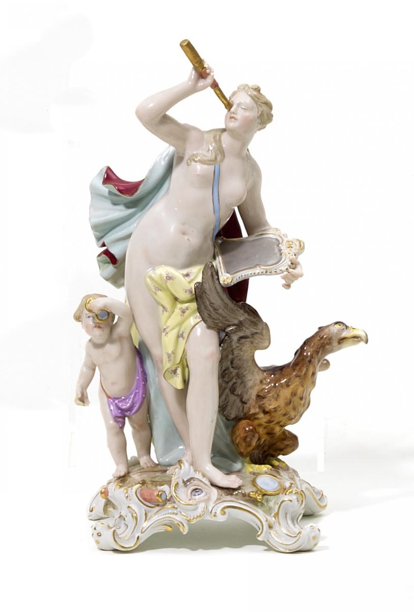 Porzellan, farbig und gold staffiert. Aus der Serie 'Die fünf Sinne'. Allegorie, Spiegel und Fernglas haltend, begleitet von