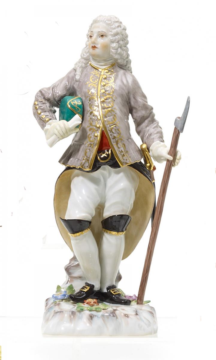 Porzellan, farbig und gold staffiert. Auf quadratischen Sockel mit Blumen. Höhe 22,5cm. Zustand B/C.